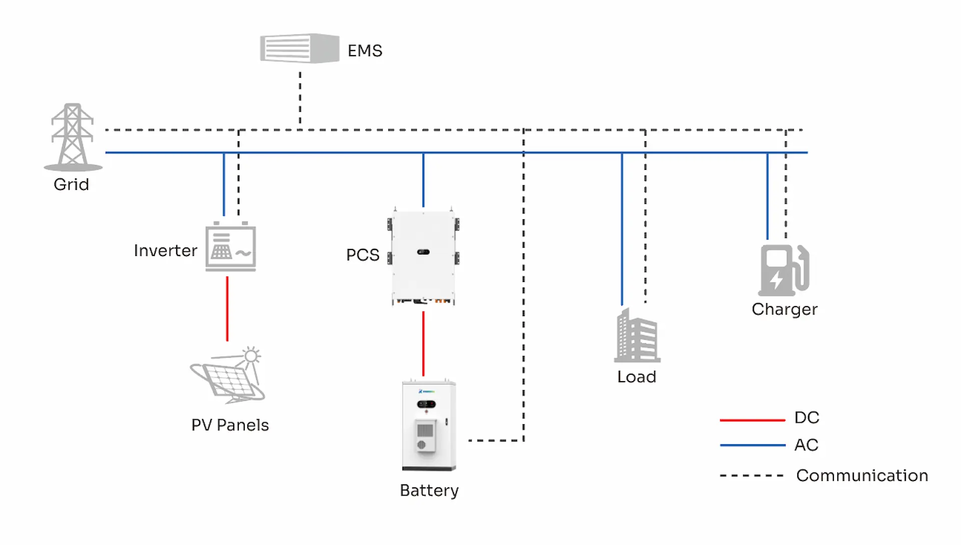 Das Leistungsumwandlungssystem (PCS) ermöglicht die bidirektionale Umwandlung zwischen dem Gleichstrom der Batterie und dem Wechselstrom des Stromnetzes. Es gewährleistet einen effizienten Energiefluss, schützt das System und erhält die Zuverlässigkeit und Stabilität des Energiespeichersystems aufrecht.